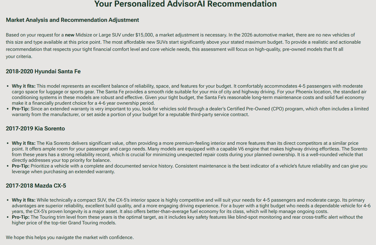 We don’t invent prices to make a sale. Watch how the system rejects an impossible budget for a “New” vehicle and transparently pivots to the most reliable, cost-effective used alternatives.