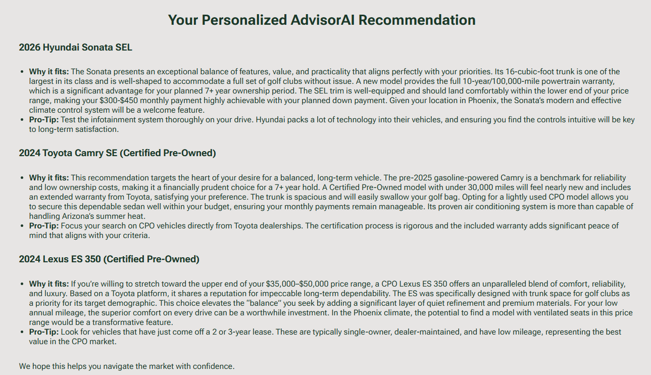 Real Scenarios. Unbiased Advice. AutoAdvisorAI doesn’t just pull generic lists of cars. Our system acts as a strict, unbiased auditor for your automotive needs. It cross-references your exact budget, local market conditions, and physical constraints against current manufacturer production data.