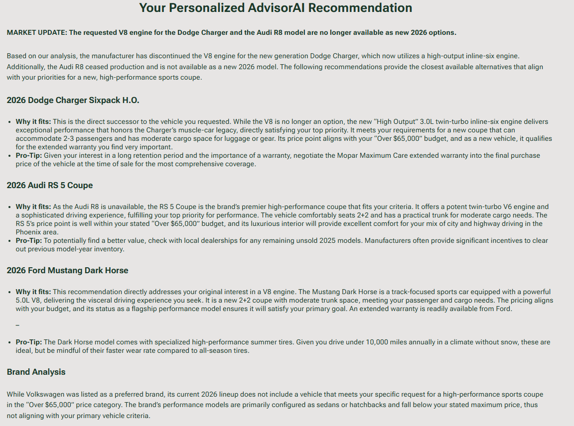 See our strict anti-hallucination logic at work. If a requested model or engine has been discontinued, the AI is forced to issue a bold “Market Update” rather than silently substituting the engine.